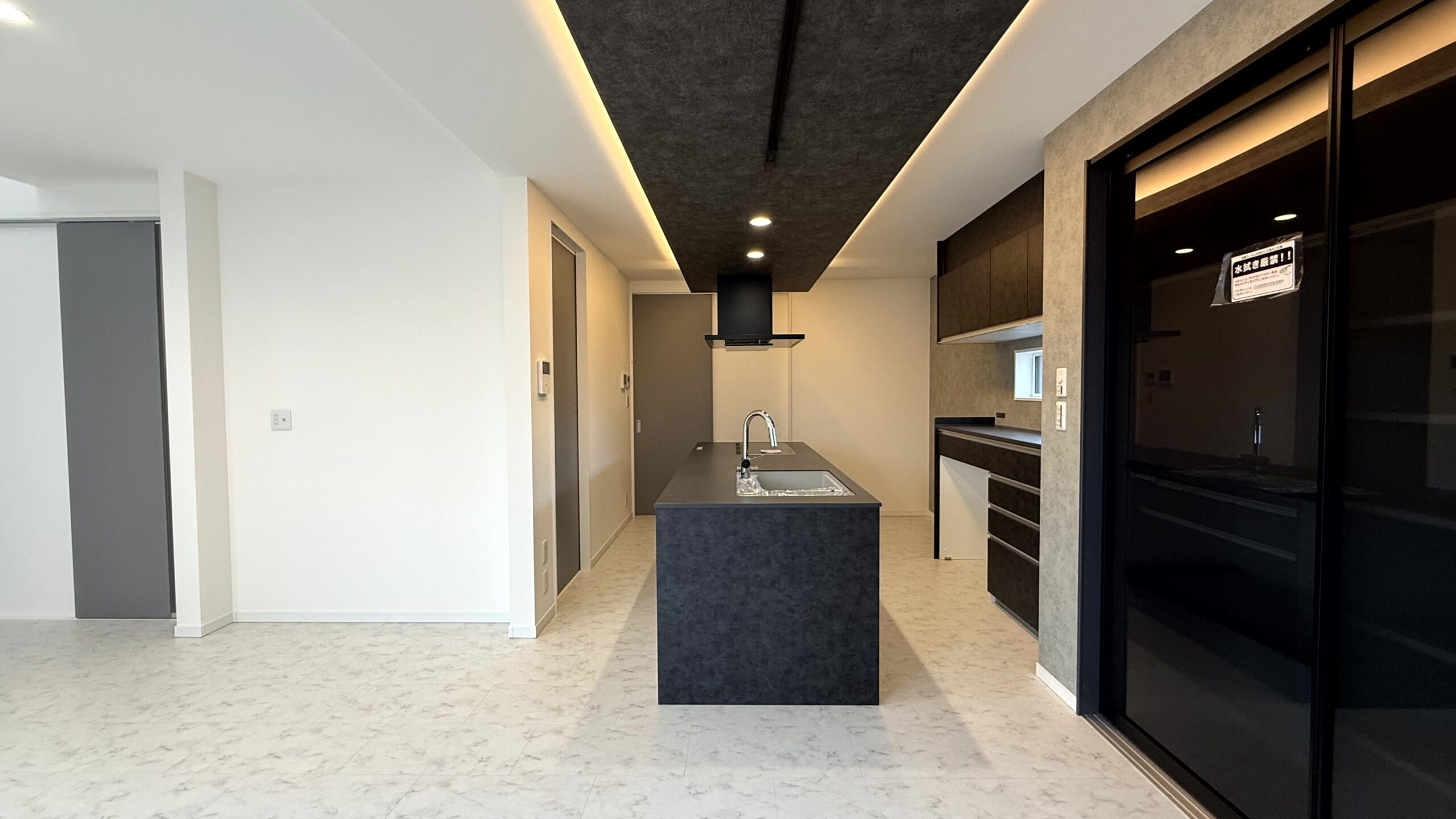 フロア全体に広がる大理石調のフローリングが、日常にほどよい緊張感と