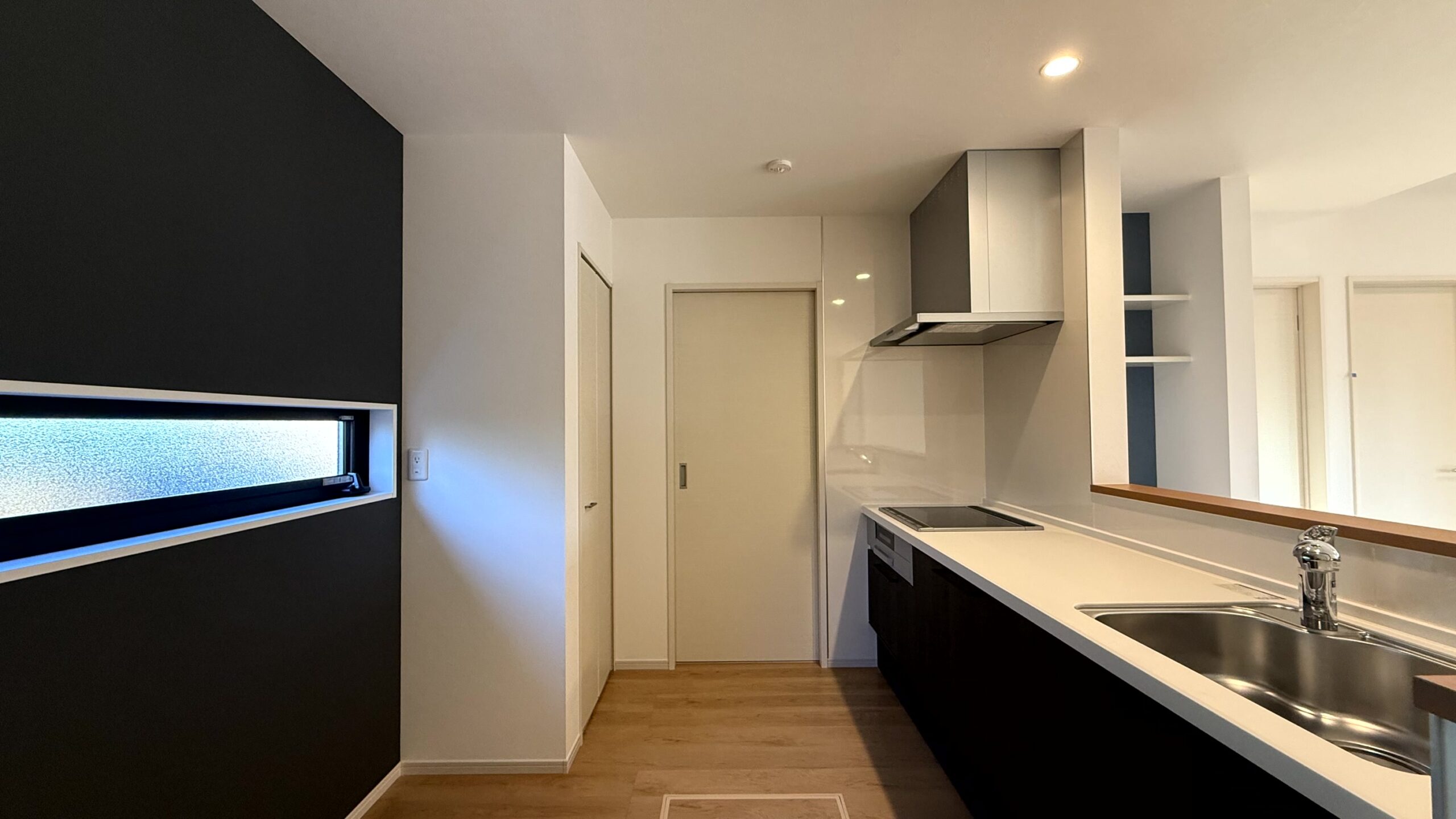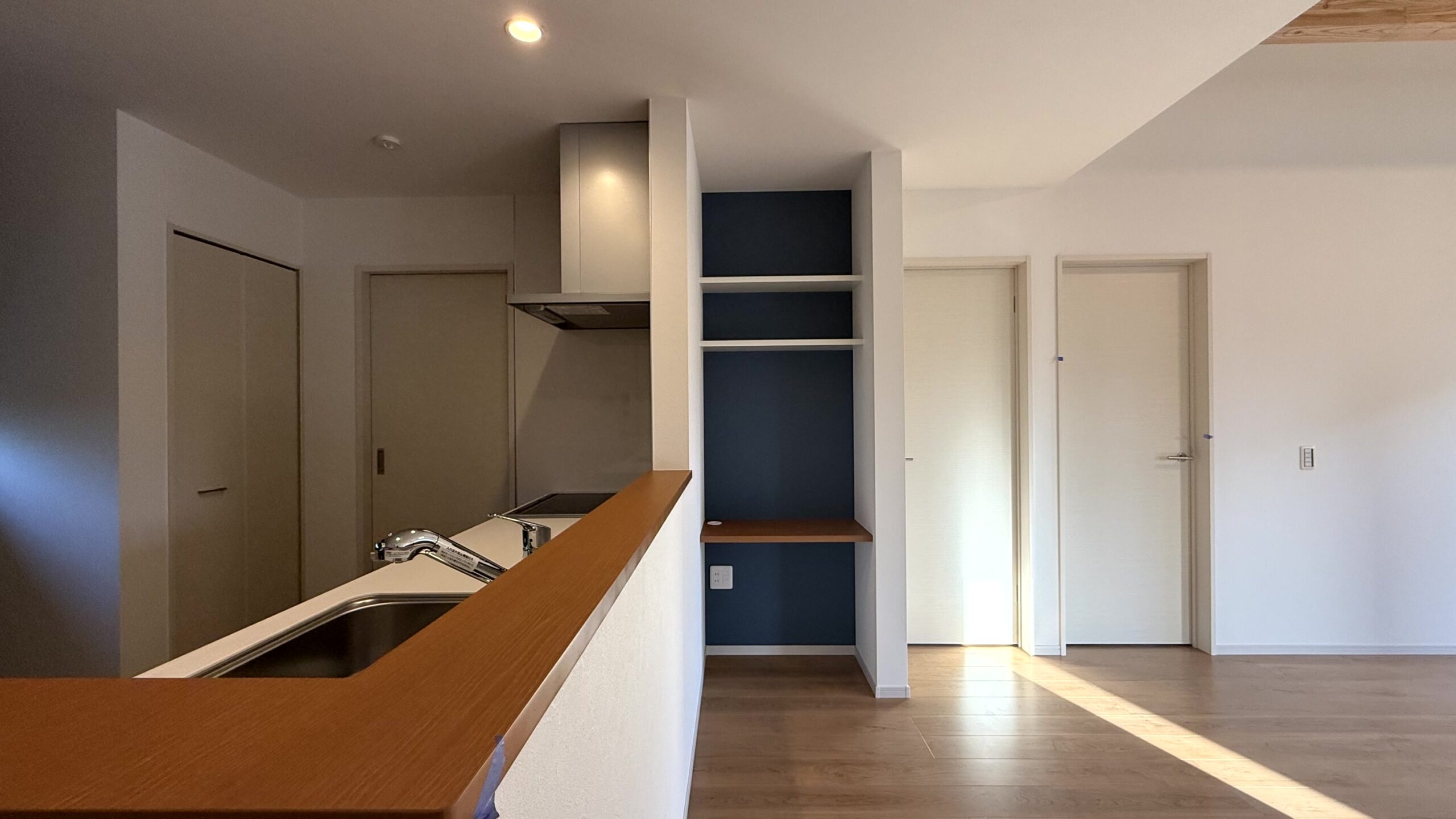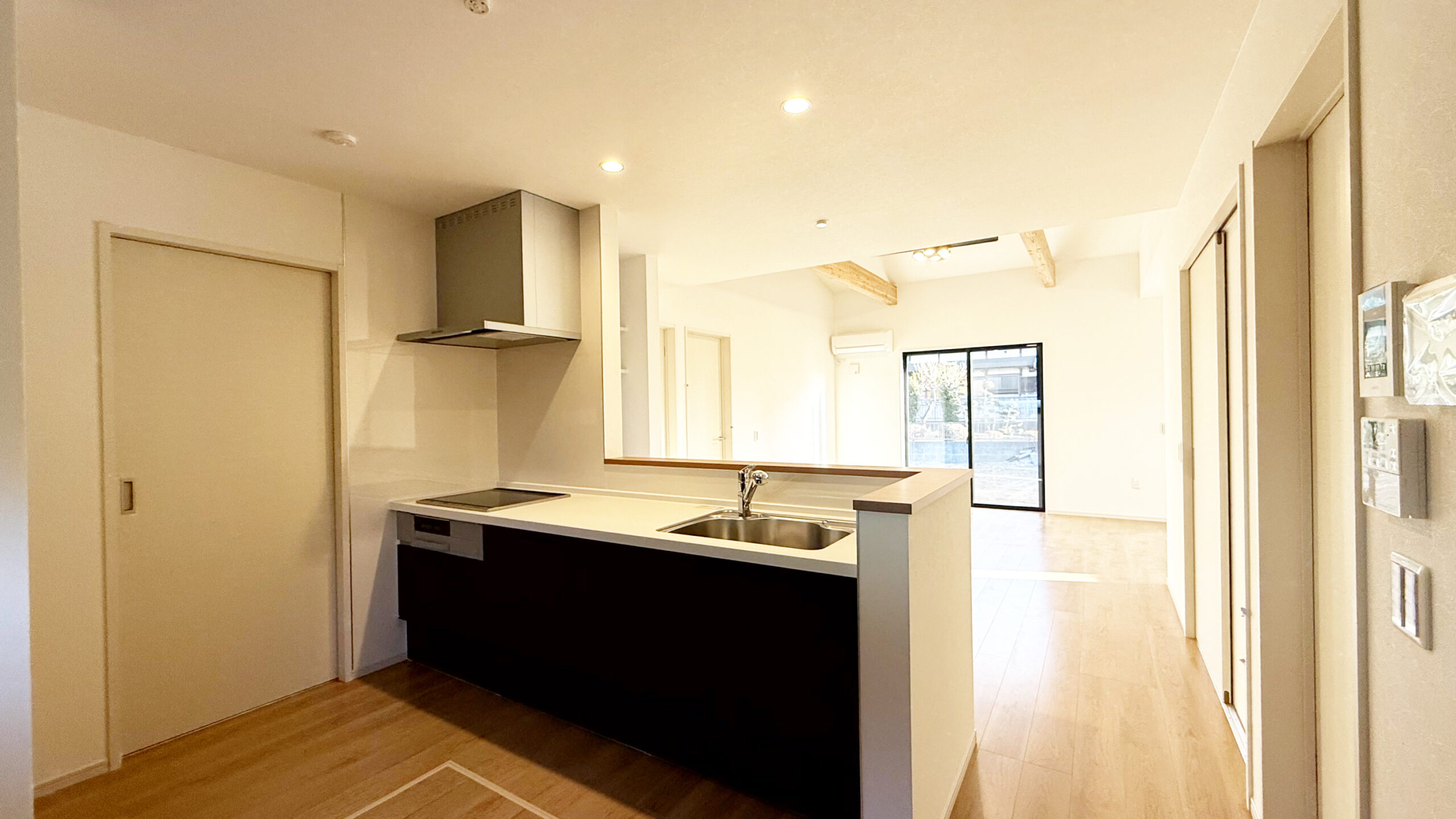 対面式のキッチンからはリビング全体が見渡せ、家事動線もスムーズに。